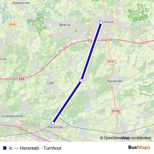 The first stop of the Ic rail route is Herentals and the last stop is Turnhout. Ic (Herentals - Turnhout) is operational during tous les jours.