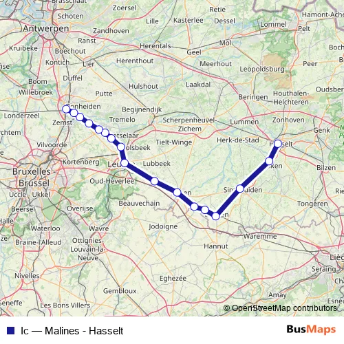 The first stop of the Ic rail route is Hasselt and the last stop is Malines. Ic (Malines - Hasselt) is operational during tous les jours.
