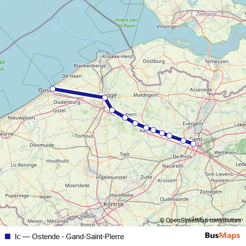 The first stop of the Ic rail route is Gand-Saint-Pierre and the last stop is Ostende. Ic (Ostende - Gand-Saint-Pierre) is operational during tous les jours.