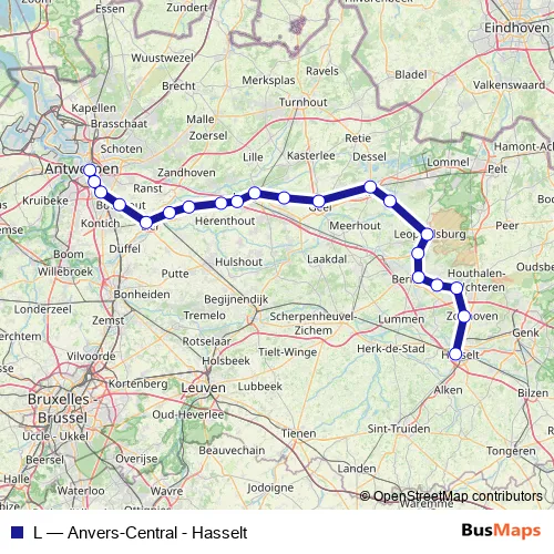 The first stop of the L rail route is Anvers-Central and the last stop is Hasselt. L (Anvers-Central - Hasselt) is operational during en semaine.