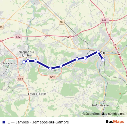 The first stop of the L rail route is Jemeppe-sur-Sambre and the last stop is Jambes. L (Jambes - Jemeppe-sur-Sambre) is operational during tous les jours.