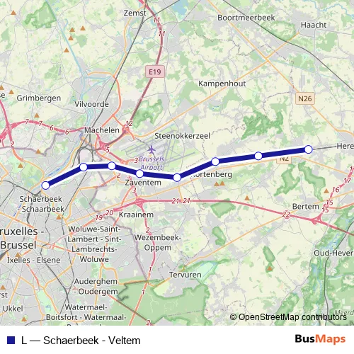 The first stop of the L rail route is Veltem and the last stop is Schaerbeek. L (Schaerbeek - Veltem) is operational during tous les jours.