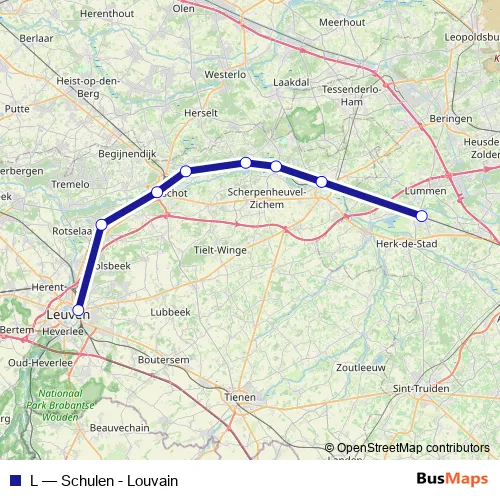 The first stop of the L rail route is Louvain and the last stop is Schulen. L (Schulen - Louvain) is operational during en semaine.