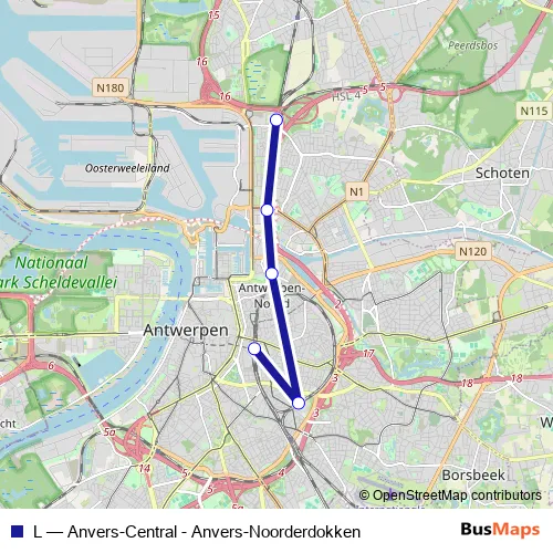 Click here to view the nearest L - Anvers-Central - Anvers-Noorderdokken rail stop.