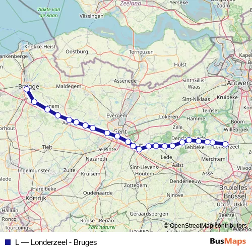 The first stop of the L rail route is Londerzeel and the last stop is Bruges. L (Londerzeel - Bruges) is operational during le week-end.