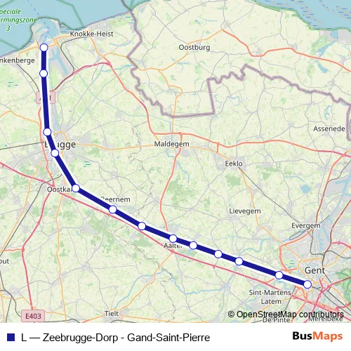 The first stop of the L rail route is Zeebrugge-Dorp and the last stop is Gand-Saint-Pierre. L (Zeebrugge-Dorp - Gand-Saint-Pierre) is operational during tous les jours.