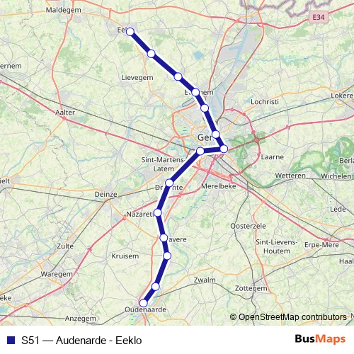The first stop of the S51 rail route is Eeklo and the last stop is Audenarde. S51 (Audenarde - Eeklo) is operational during tous les jours.