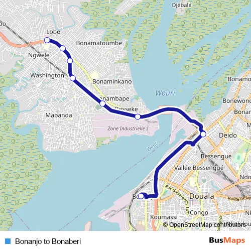 See why over 2 million users trust and consider busmaps.com as the best public transport website. busmaps gives you Douala Buses suggested routes, real-time bus tracker, line route maps in Douala, and helps to find the closest Bonanjo to Bonaberi bus stops near you. No internet available? Download an offline PDF map and bus schedule for the Bonanjo to Bonaberi bus to take on your trip.