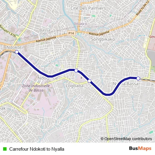 The first stop of the Carrefour Ndokoti to Nyalla bus route is Carrefour Tunnel Ndokoti. Logbaba Route de Japoma and the last stop is Nyalla, Entre le Blibloquet. Carrefour Ndokoti to Nyalla (Carrefour Ndokoti to Nyalla) is operational during tous les jours.
