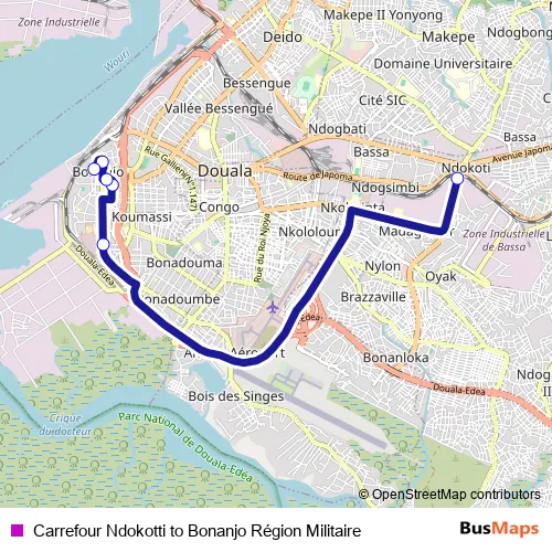 Carrefour Ndokotti to Bonanjo Région Militaire bus Route Map