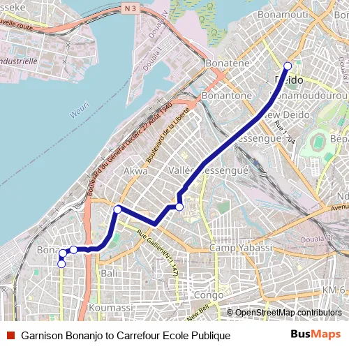 Garnison Bonanjo to Carrefour Ecole Publique bus Route Map