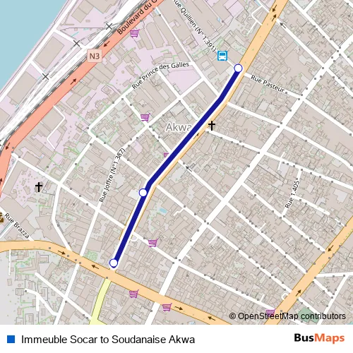 Additional information: Immeuble Socar to Soudanaise Akwa has 3 stops and the total trip duration for this route is approximately 3 minutes.