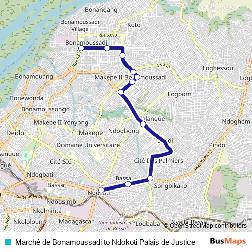 Additional information: Marché de Bonamoussadi to Ndokoti Palais de Justice has 11 stops and the total trip duration