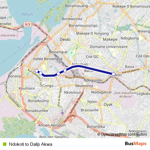 See why over 2 million users trust and consider busmaps.com as the best public transport website. busmaps gives you Douala Buses suggested routes, real-time bus tracker, line route maps in Douala, and helps to find the closest Ndokoti to Dalip Akwa bus stops near you. No internet available? Download an offline PDF map and bus schedule for the Ndokoti to Dalip Akwa bus to take on your trip.