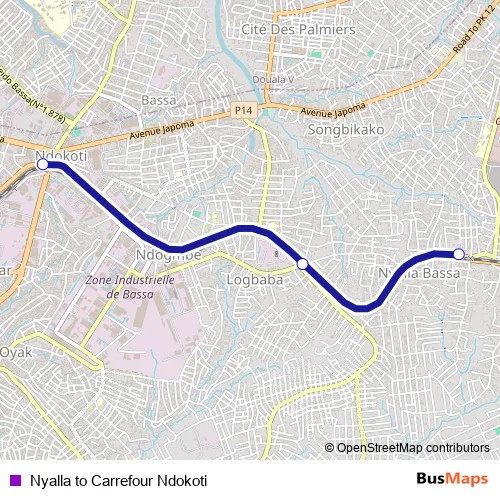 The first stop of the Nyalla to Carrefour Ndokoti bus route is Nyalla, Entre le Blibloquet and the last stop is Tunnel Ndokoti, Route de Japoma. Nyalla to Carrefour Ndokoti (Nyalla to Carrefour Ndokoti) is operational during tous les jours.
