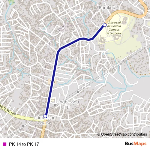 The first stop of the PK 14 to PK 17 bus route is PK 14 and the last stop is PK 17 Université de Doula Campus de Logbessou. PK 14 to PK 17 (PK 14 to PK 17) is operational during tous les jours.