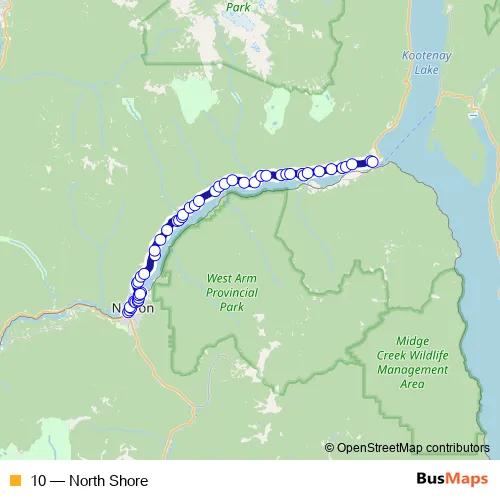The first stop of the 10 bus route is Nelson Exchange Bay A and the last stop is Balfour Ferry Terminal. 10 (North Shore) is operational during tous les jours.
