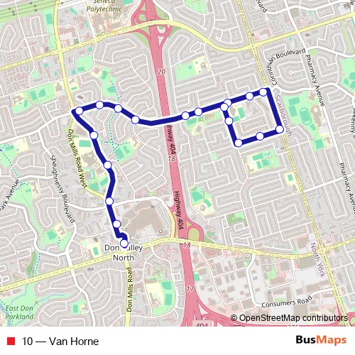 The first stop of the 10 bus route is Don Mills Station and the last stop is Brian Ave at Van Horne Ave. 10 (Van Horne) is operational during en semaine.