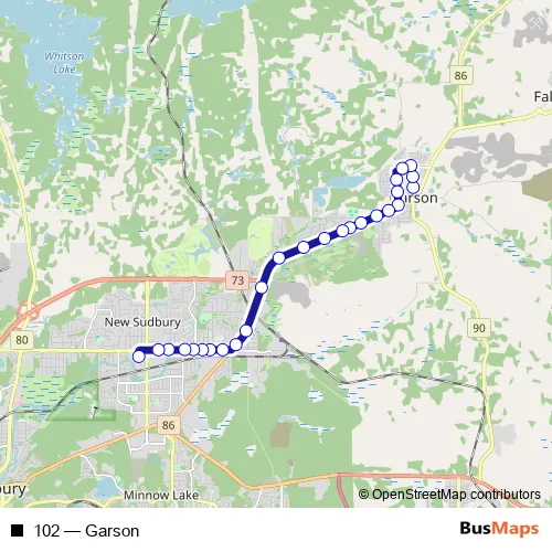 The first stop of the 102 bus route is Garson and the last stop is New Sudbury Transit Hub. 102 (Garson) is operational during tous les jours.