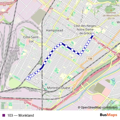 The first stop of the 103 bus route is Station Villa-Maria and the last stop is Côte-Saint-Luc / Hudson. 103 (Monkland) is operational during tous les jours.
