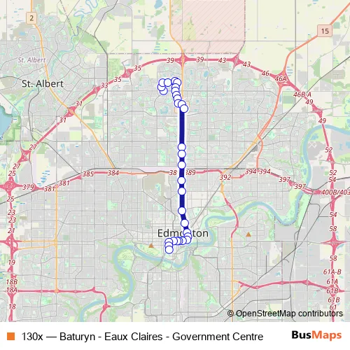 The first stop of the 130x bus route is 109 Street & Castle Downs Road and the last stop is Government Transit Centre. 130x (Baturyn - Eaux Claires - Government Centre) is operational during en semaine.