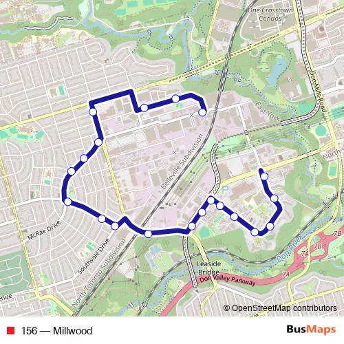 The first stop of the 156 bus route is Wicksteed Ave at Leslie St and the last stop is Thorncliffe Park Dr (East) at Overlea Blvd. 156 (Millwood) is operational during tous les jours.