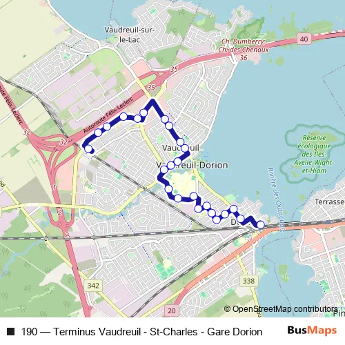 The first stop of the 190 bus route is Gare Dorion and the last stop is Terminus Vaudreuil - Quai 11. 190 (Terminus Vaudreuil - St-Charles - Gare Dorion) is operational during tous les jours.