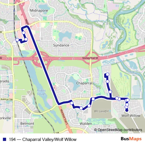The first stop of the 194 bus route is EB Shawville WY @ W. of Shawville LI Se and the last stop is EB Chaparral Valley SQ @ Chaparral Valley LI Se. 194 (Chaparral Valley/Wolf Willow) is operational during en semaine.