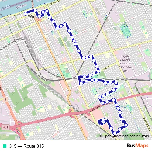 Church Street - Goyeau Street - City Hall Square - University Avenue East - Glengarry Avenue - Elliott Street East - Erie Street - Giles Boulevard - Parent Avenue - Shephard Street East - Parent Avenue - Tecumseh Road East - Forest Avenue - Tecumseh Road East - Lens Avenue - Hall Avenue - Ypres Avenue - Memorial Drive - Eugenie Street - Bensette Street - South Pacific Avenue - Southdale Drive - Grand Marais Road East - North Service Road - Conservation Drive - Calderwood Avenue - Kamloops Street - Marentette Avenue - Sydney Avenue