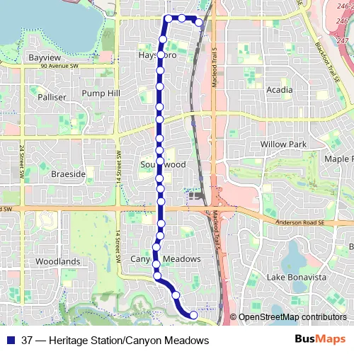 The first stop of the 37 bus route is SB 6 ST SW @ Canyon Meadows DR Sw and the last stop is Heritage LRT Station. 37 (Heritage Station/Canyon Meadows) is operational during tous les jours.