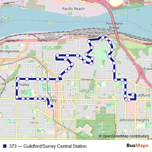 The first stop of the 373 bus route is Surrey Central Station @ Bay 4 and the last stop is Guildford Exchange @ Bay 4. 373 (Guildford/Surrey Central Station) is operational during tous les jours.