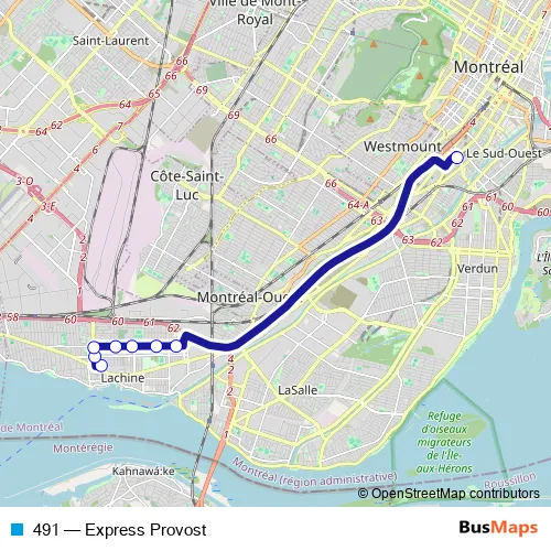 The first stop of the 491 bus route is Remembrance / 32e Avenue and the last stop is Station Lionel-Groulx. 491 (Express Provost) is operational during en semaine.