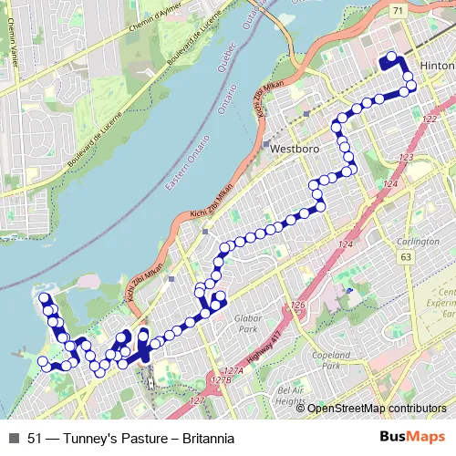 The first stop of the 51 bus route is Britannia Park Loop and the last stop is Tunney'S Pasture D. 51 (Tunney's Pasture – Britannia) is operational during tous les jours.