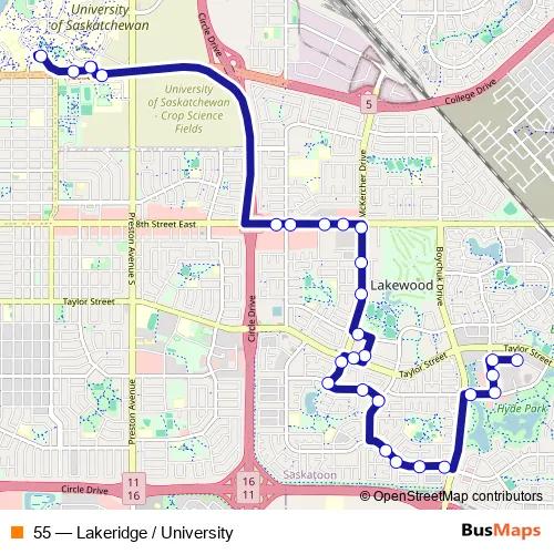 Schedules and stops for this route are published in GTFS: saskatoon-transit