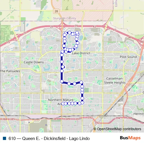 The first stop of the 610 bus route is 95A Street & 132 Avenue Nearside and the last stop is 91 Street & 168 Avenue. 610 (Queen E. - Dickinsfield - Lago Lindo) is operational during en semaine.