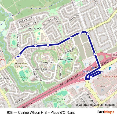 The first stop of the 638 bus route is Jeanne Darc / Bilberry and the last stop is Place D'Orléans E. 638 (Cairine Wilson H.S – Place d'Orléans) is operational during en semaine.