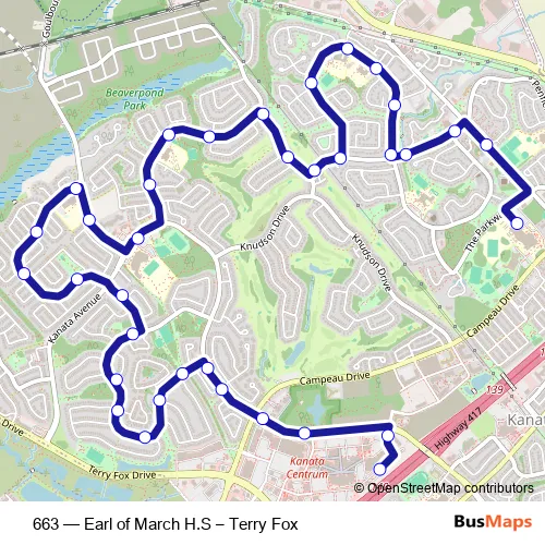 The first stop of the 663 bus route is Terry FOX 4c and the last stop is Parkway / Earl OF March H.S.. 663 (Earl of March H.S – Terry Fox) is operational during en semaine.