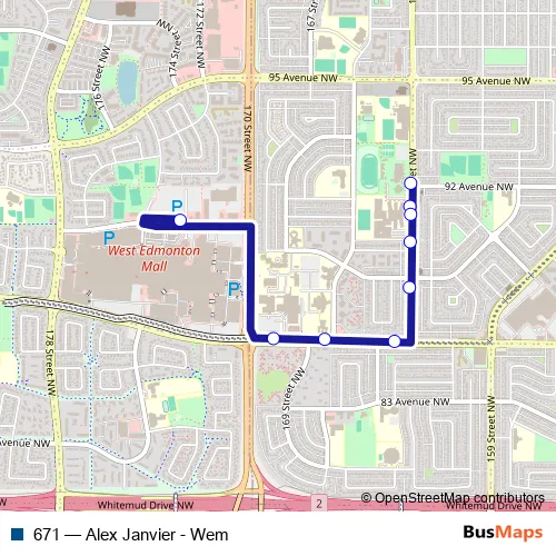 The first stop of the 671 bus route is 163 Street & 92 Avenue and the last stop is West Edmonton Mall Transit Centre. 671 (Alex Janvier - Wem) is operational during en semaine.
