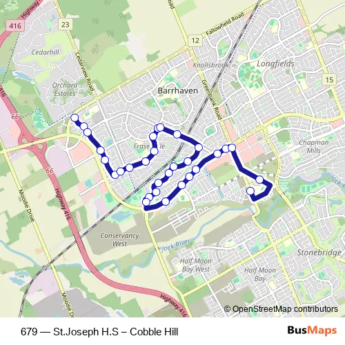 The first stop of the 679 bus route is Cobble Hill / Fallowfield and the last stop is ST Joseph H.S. 679 (St.Joseph H.S – Cobble Hill) is operational during en semaine.