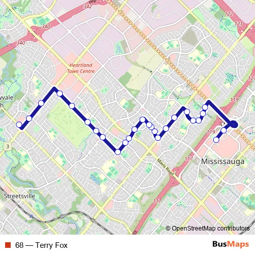 The first stop of the 68 bus route is City Centre Transit Terminal Platform A and the last stop is Creditview Rd North Of Britannia Rd. 68 (Terry Fox) is operational during tous les jours.