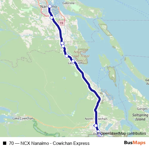 Services on the 70 - NCX Nanaimo - Cowichan Express bus stop at 20:01 on lundi, mardi, mercredi, jeudi, vendredi, samedi, dimanche.