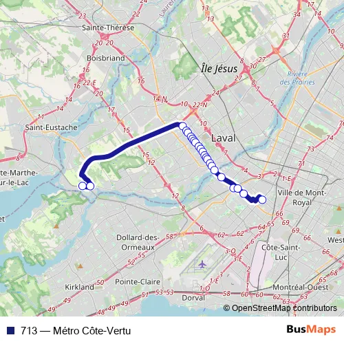 The first stop of the 713 bus route is Station Sainte-Dorothée Quai: 1 and the last stop is Métro Côte-Vertu Quai: 18. 713 (Métro Côte-Vertu) is operational during en semaine.