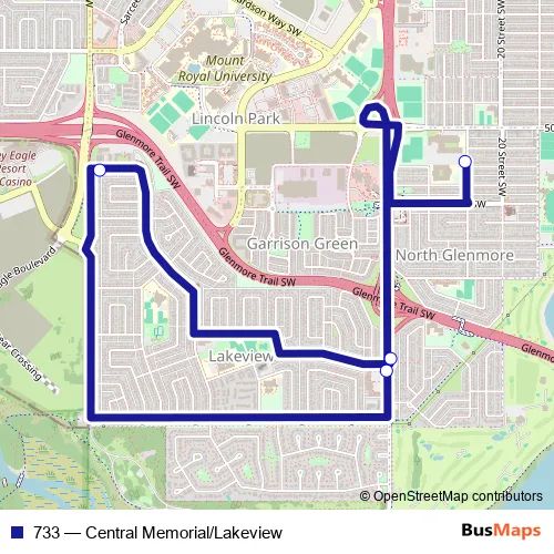 The first stop of the 733 bus route is SB 21 ST SW @ 51 AV Sw and the last stop is NB Crowchild TR @ 63 AV Sw. 733 (Central Memorial/Lakeview) is operational during en semaine.
