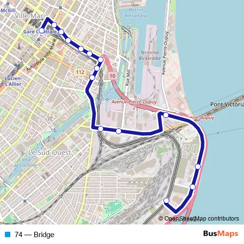 The first stop of the 74 bus route is Station Bonaventure (De La Gauchetière / Mansfield and the last stop is Marc-Cantin / Studios Mels. 74 (Bridge) is operational during tous les jours.