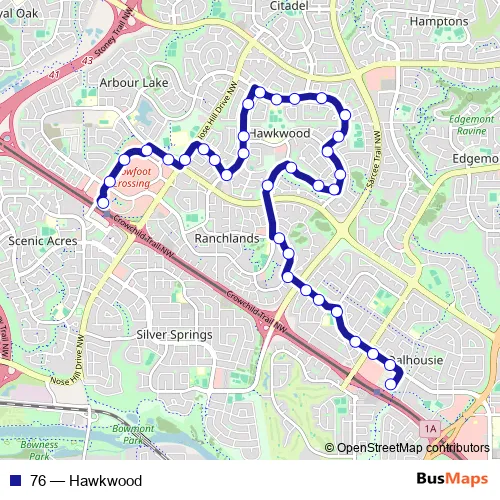 The first stop of the 76 bus route is Crowfoot LRT Station and the last stop is Dalhousie LRT Station Nb. 76 (Hawkwood) is operational during tous les jours.
