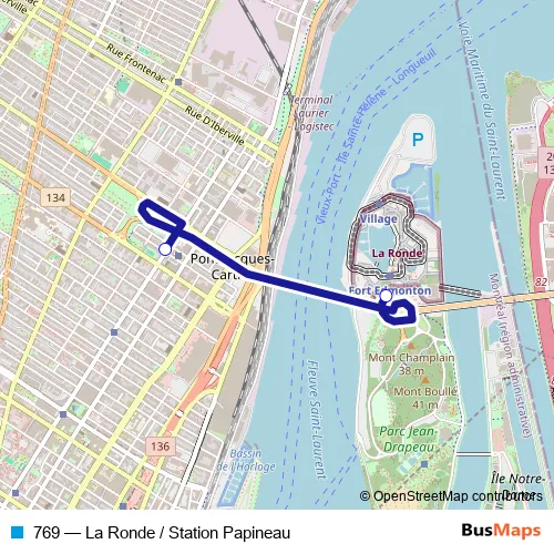 The first stop of the 769 bus route is La Ronde and the last stop is Station Papineau (De Maisonneuve / Cartier). 769 (La Ronde / Station Papineau) is operational during le week-end.