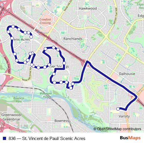 The first stop of the 836 bus route is EB Varsity DR @ 49 ST Nw and the last stop is SB Scurfield DR @ Scenic GD Nw. 836 (St. Vincent de Paul/ Scenic Acres) is operational during en semaine.