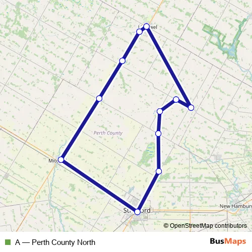 The first stop of the A bus route is Stratford: Cooper Terminal is #8 Stratford Transit and the last stop is Stratford: Cooper Terminal is #8 Stratford Transit. A (Perth County North) is operational during tous les jours.