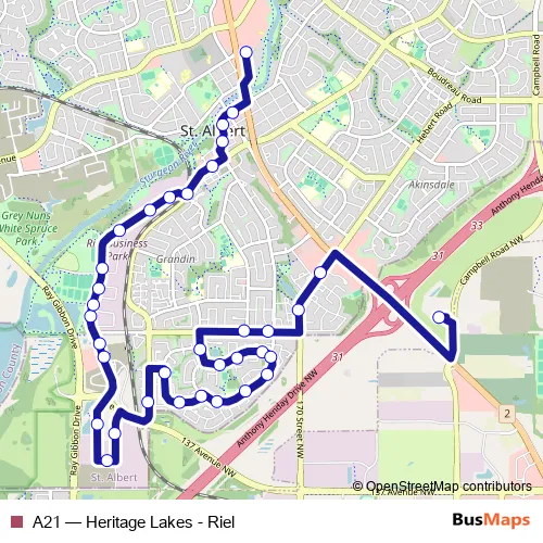 The first stop of the A21 bus route is Nakî Transit Station and Park and Ride and the last stop is St. Albert Centre Exchange. A21 (Heritage Lakes - Riel) is operational during en semaine.