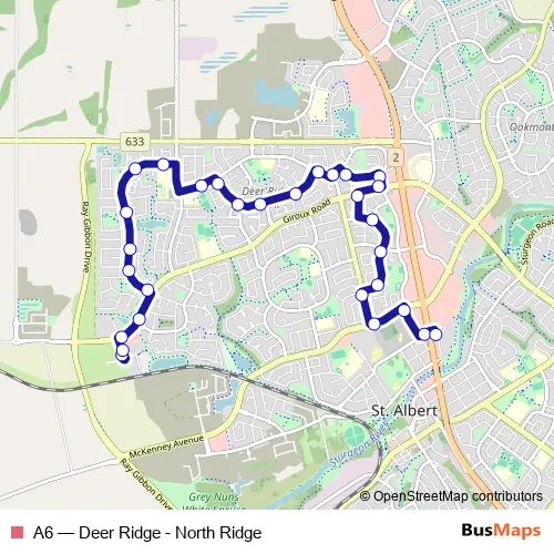 The first stop of the A6 bus route is Versailles Avenue & Giroux Road and the last stop is St. Albert Centre Exchange. A6 (Deer Ridge - North Ridge) is operational during tous les jours.